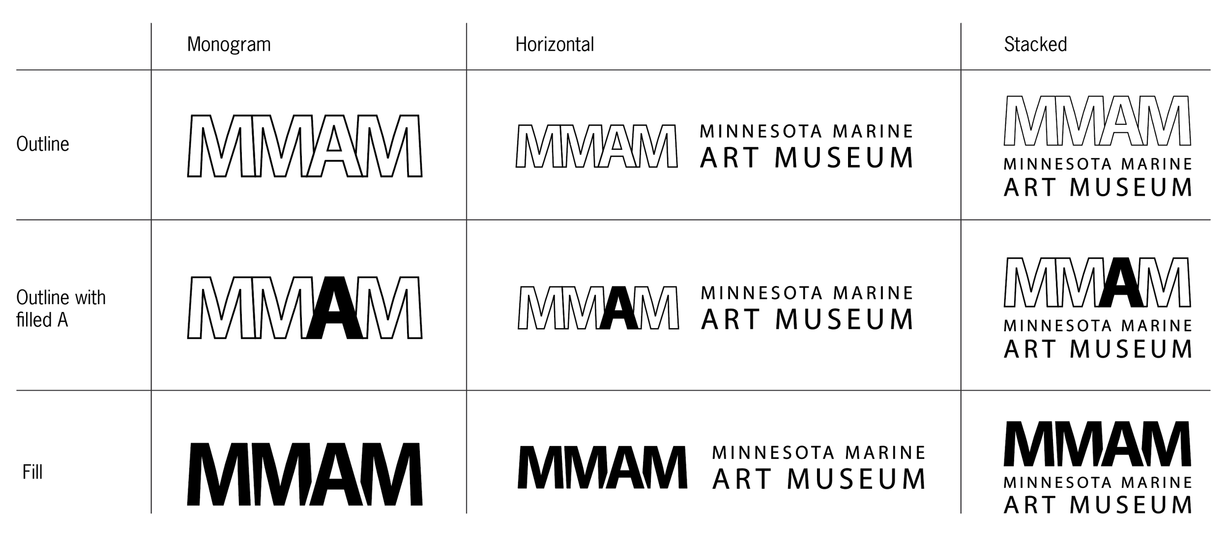 The MMAM team requested minimal changes to their logo for this phase of the project. The updated logo uses one color as opposed to four. There are nine variations that can be used interchangeably depending on needs. The combination of increased weight and decreased tracking improves its readability, making it easier to read at smaller scales.